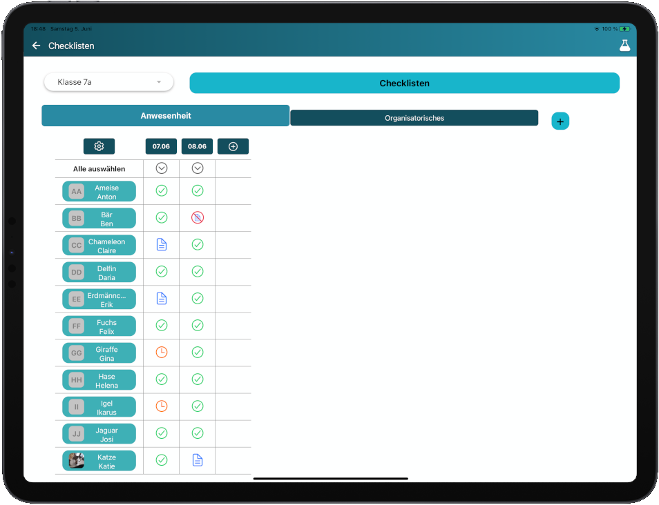 Sind alle anwesend? Haben alle ihre Arbeit unterschreiben lassen? Von wem fehlt der ausgefüllte Elternbrief? Behalten Sie den Überblick mit den Checklisten von MagistRatio! Erstellen Sie eigene Listen für jegliche Belange und erhalten Sie schnell und einfach den Überblick. Mit nur einem Klick haken Sie für jeden Schüler ab, oder vermerken, dass etwas fehlt. Bye Bye Zettel-Chaos!