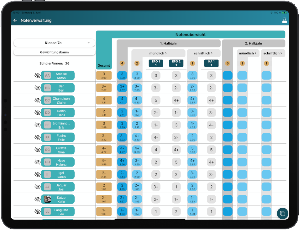 Das Kernstück der App. Notenlisten, Gewichtungen, automatische Berechnung, Korrektur von Klassenarbeiten, und, und, und. Alles in einer Anwendung – probieren Sie es aus!