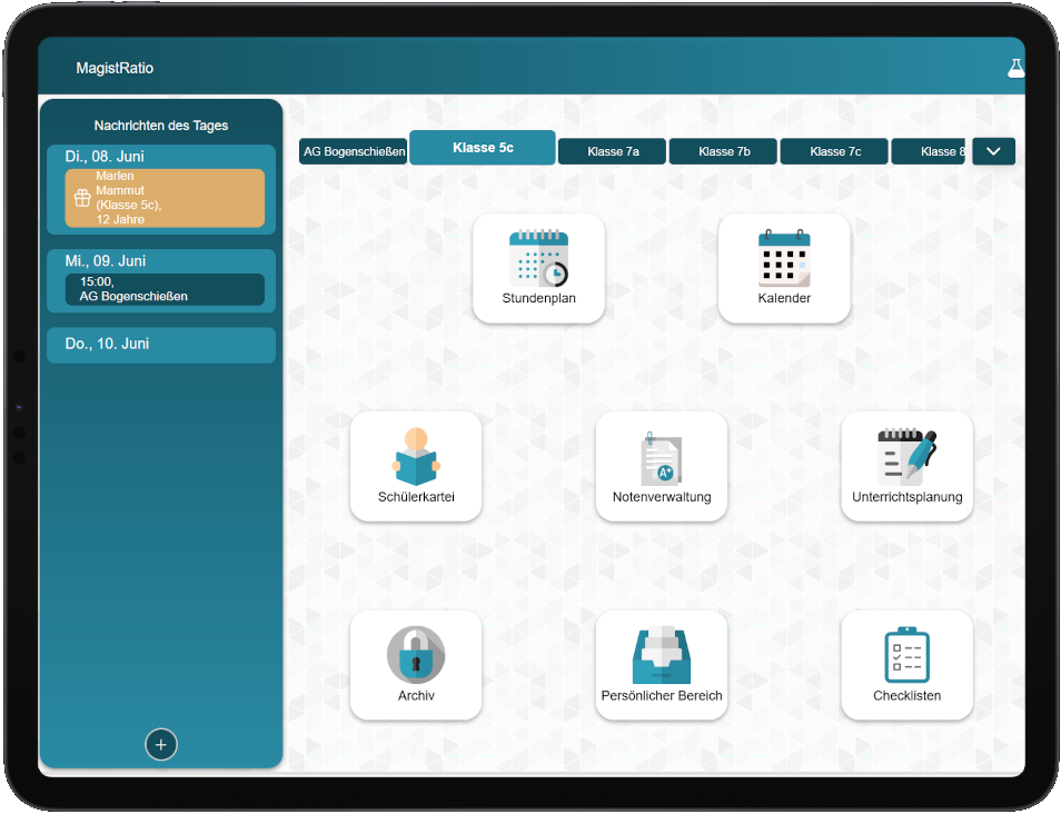 Noten in einem analogen Notenheft? Auswertung von Klassenarbeiten auf Papier oder Excel? Unterrichtsvorbereitung in Ordnern? Notizen und Gesprächsprotokolle auf Papier oder in einem Schreibprogramm? MagistRatio vereint all dies und Sie brauchen künftig nur noch eine Anwendung für Alles.
