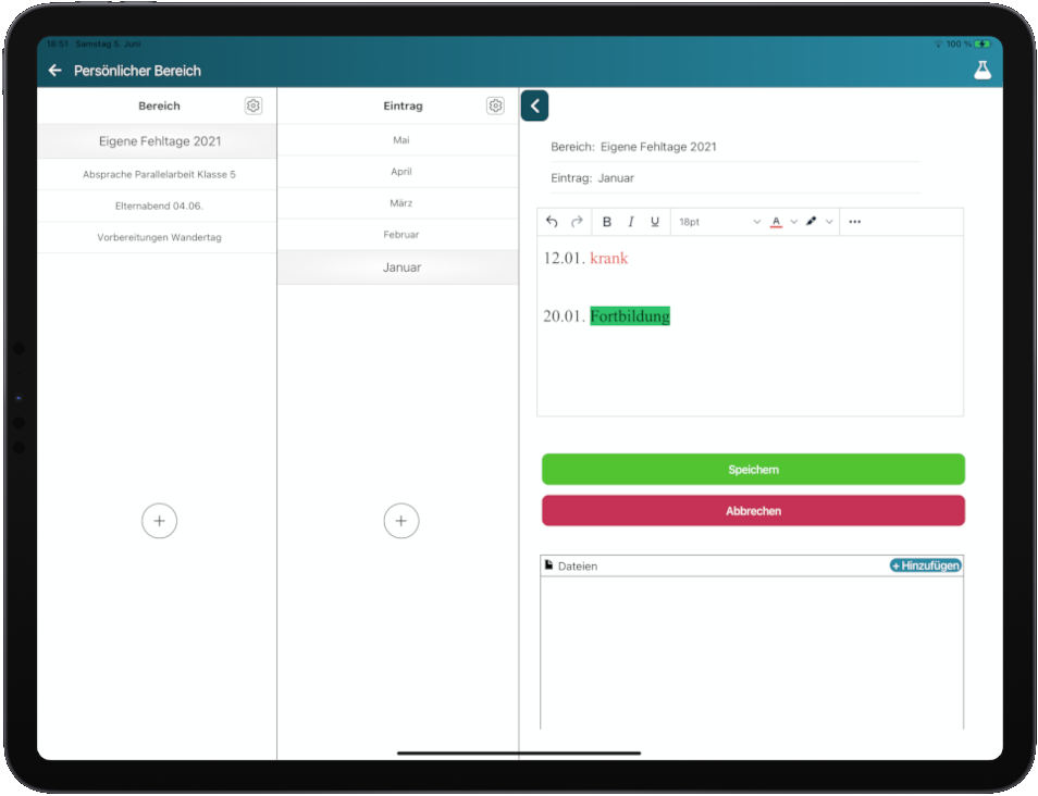 Zum Lehrer-Sein gehört mehr als nur Unterricht. Wandertage, Klassenfahrten, Elterngespräche, Projektwochen und Elternabende. All diese Dinge wollen organisiert werden, aber wo? Ordner für Alles in Massen oder das pure Chaos der Zettelwirtschaft gehören ab sofort der Vergangenheit an. In Ihrem persönlichen Bereich ist Platz für die Planung aller anderen Aufgaben. Ähnlich aufgebaut wie die Unterrichtsvorbereitung, können Sie hier Notizen verfassen und wichtige Dateien hochladen. Die individuelle Nutzbarkeit des Bereichs bietet Raum für Ideen, Planung und einen Ort für Alles, was ein Lehrer oder eine Lehrerin sonst noch so erledigen muss.